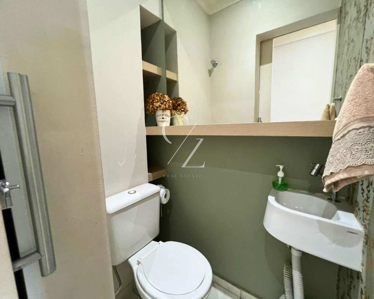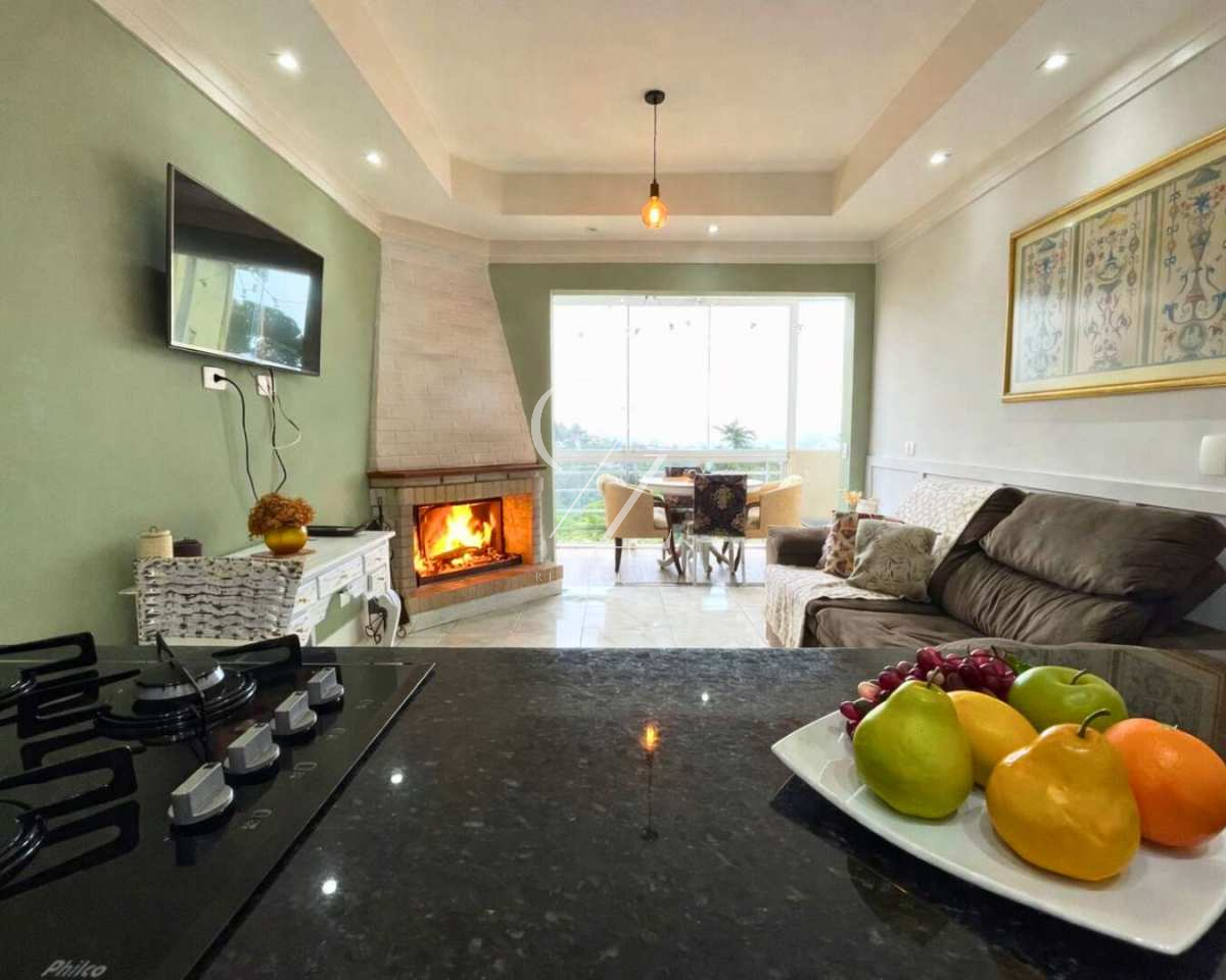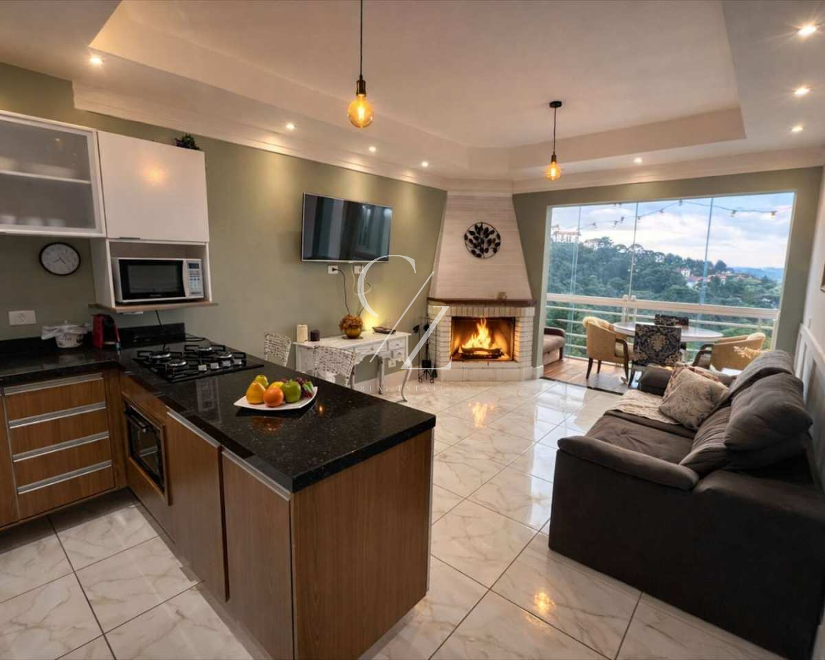 No piso inferior, a integração da cozinha com a sala de jantar cria um ambiente contemporâneo e funcional, ideal para convivência. A lareira reforça o clima de montanha que sustenta a demanda na região, enquanto a varanda totalmente envidraçada amplia a luminosidade e transforma o espaço em um refúgio para todas as estações. Lavabo social complementa a praticidade do layout.